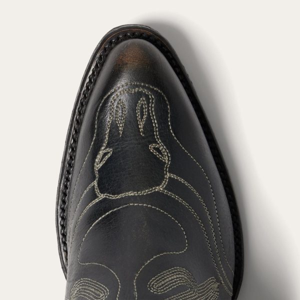 These metro toe shorty boots are handcrafted from high-quality black leather, with a 5″ elastic shaft. The vamp features a stunning, vintage-style, Western-inspired embroidered detail. Their single stitched welt design features a stacked leather heel, lemonwood pegs, brass nail construction, a stylish snip toe and an all leather sole. The cushioned insole and all-leather lining ensure comfort and a perfect fit.