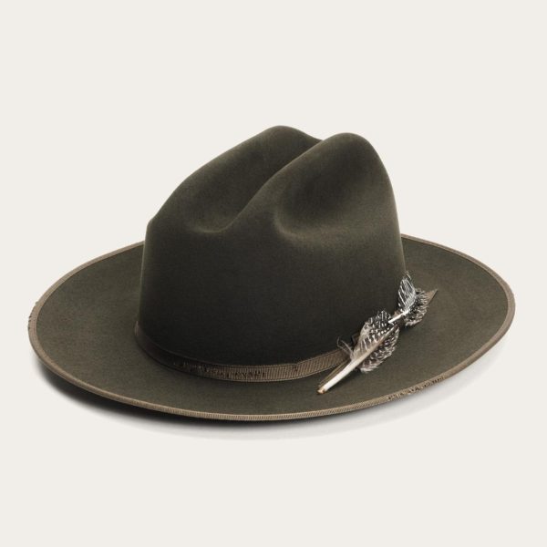 The 1865 Distressed Open Road Royal Deluxe features a genuine leather sweatband and a 4 ¼” crown outfitted with a grosgrain hat band, an eye-catching feather detail and a hat pin honors Stetson’s Western heritage—and a nod to the pioneering spirit that lives on in every hat we sell.